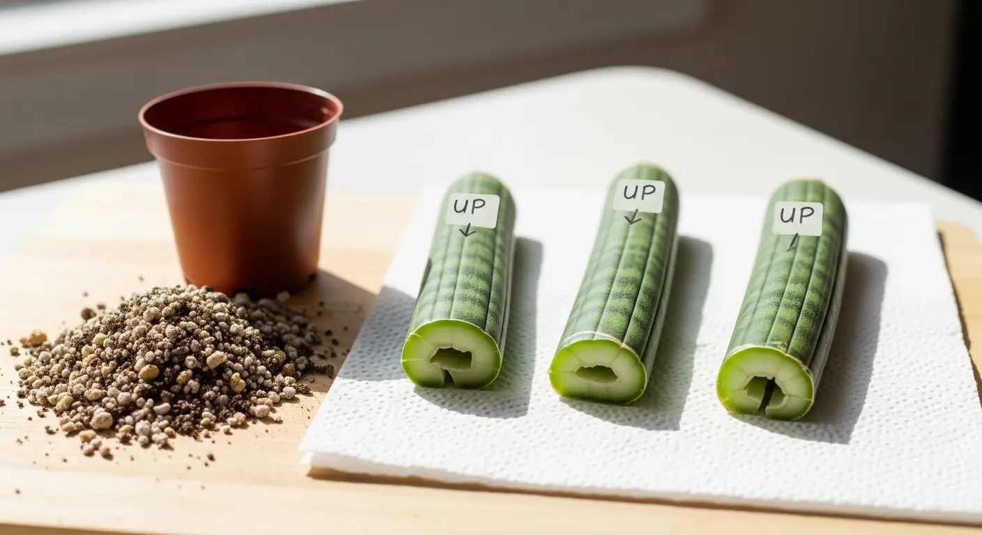 Easy leaf cuttings for snake plants: segment, callus, and root for quick new starts before winter dormancy.