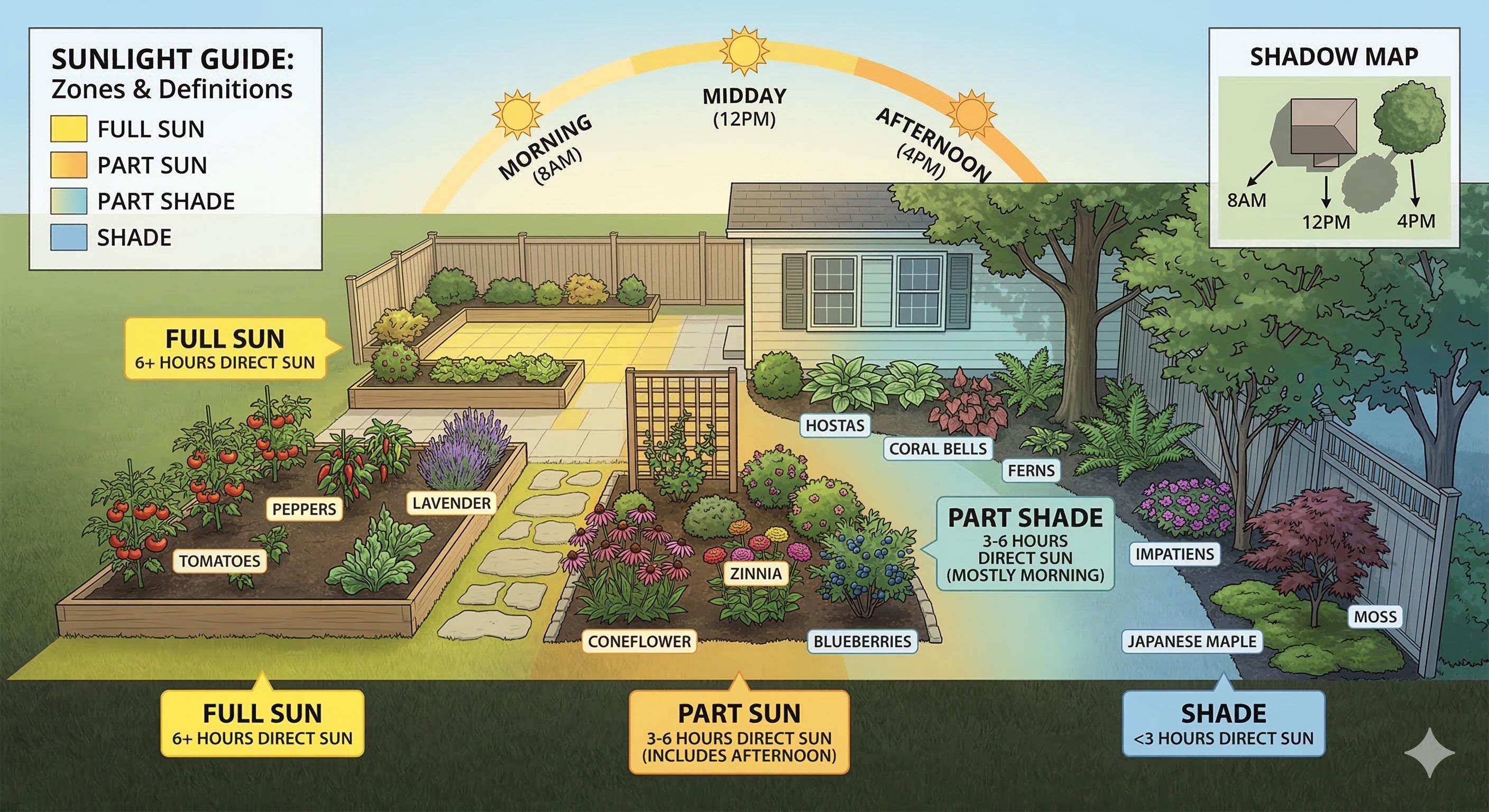 A plant label may say full sun, part sun, partial shade, or full shade. Those words matter a lot.